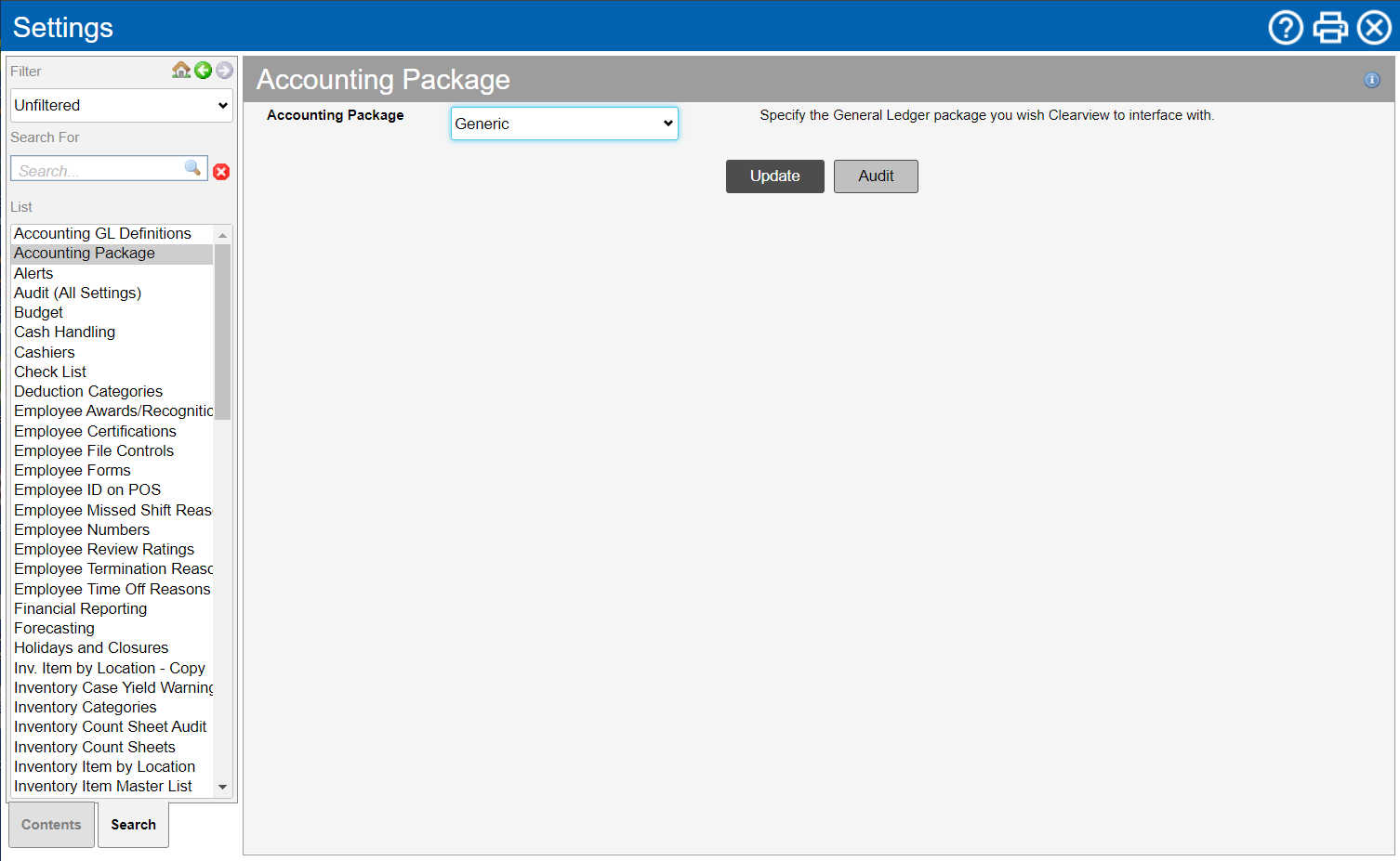 The Accounting Package settings allow you to select the accounting package used by your organization so that files exported from CLEARVIEW are in a format that can be read by your accounting package.