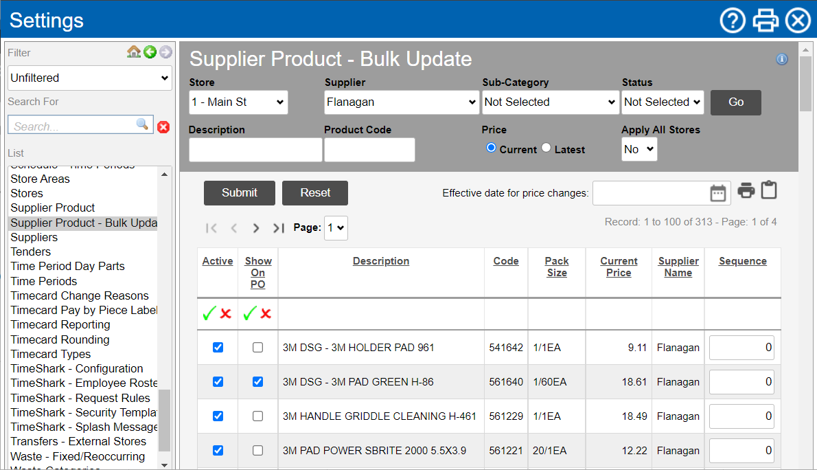 Your Supplier Products should already be set up for you by CLEARVIEW. The Supplier Product An inventory item in a package size available from a particular supplier. - Bulk Update page allows you to activate, deactivate and change the Show On PO, Current Price and Sequence of multiple supplier products easily.